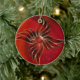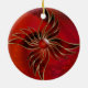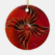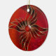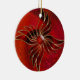 An abstract work in fiery red and gold. A clear red gem is surrounded by gold-edged flames accented with sparkling rubies and yellow starbursts. The swirling, spiralling fractals in the background appear in deeper colours inside the gold filigree of the flame motif.