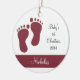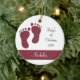 This design features a baby footprint along with the text that reads, "Baby's 1st Christmas (year). You can change the Christmas and the year also. His or her name can be customized across the bottom. On the back there are footprints that match the colour on the front. Check out my store for more colour options and other products with these footprints.