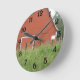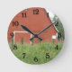 Beautiful digital photograph of a red barn sitting amongst a field of tall green grass in the distance on a sunny day.