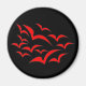 This magnet features a collection of simple images of bats flying together in a cloud pattern. The bats are red and the background is black. Kids are sure to love this cute design.