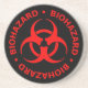 Black sandstone coaster with a red biohazard symbol and warning text.