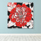 A large, red, camellia flower, in an Art Nouveau inspired style, with a floral background in black and white