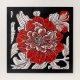 Puzzle in a large, red, camellia flower, in an Art Nouveau inspired style, with a floral background in black and white