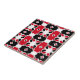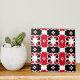 This ceramic tile exudes a sense of timeless elegance with its intricate geometric pattern. The design is symmetrical and mirrors itself both horizontally and vertically, creating a harmonious visual effect. The primary colours used in the design are red, black, and white, which are arranged meticulously to create depth and visual interest. The pattern is dominated by geometric shapes, including diamonds and circles. White shapes resembling four-petaled flowers stand out against the black background, while red diamonds with white borders are centrally placed within the larger geometric patterns. The design is repetitive, adding to the tile’s charm. This tile, with its complex pattern and vibrant colours, can enhance any space, lending it a touch of modern sophistication. It’s a perfect blend of art and functionality.