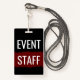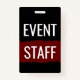 Classic event staff ID badges in a simple design printed on both sides in red black and white for corporate events, concerts, or seminars available in large quantities in bulk on a budget, or small quantities for smaller events.