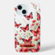 Showcase your love for nature with this beautiful phone case featuring watercolor red butterflies with black outlines, gracefully fluttering in a white field of vibrant red flowers and lush green foliage. The design is complemented by a red monogram name box adorned with red jewels, a gold outline, and bedazzling stars, offering a stunning space to personalize with your name. This case merges the beauty of nature with elegant customization, making it a perfect, eye-catching accessory for your phone.