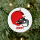 Round ceramic ornament with graphics of a red and black football helmet, on the front and a solid red, on the back. Red text, on the front has a name and black text on the back reads Christmas 2012. All text is customizable so that you can personalize for yourself or as a great gift idea to that special football player on your list. Nice has a door hanger or over head fan pull.