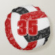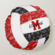 This girly volleyball themed round pillow features the realistic image of a red, black and white volleyball that has a pattern of doodle flowers, feathers and paislies in white covering the volleyball's red and black panels - personalize with the athlete's name and monogram or varsity on the front and jersey number on the back - by katz_d_zynes