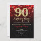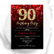 90th birthday party invitation. Elegant red black design with faux glitter gold. Features stylish diamonds, bokeh lights and script font. Men or women bday invite. Perfect for a stylish adult birthday party. Personalize with your own details. Message me if you need further customization. Printed Zazzle invitations or instant download digital printable template.