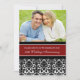 Custom photo 25th wedding anniversary party invitation card in elegant crimson red, black and white classic floral damask pattern, delicate and modern. Customizable with your party details and your own photo.
