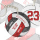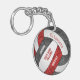 This red and black girls' volleyball double sided acrylic keychain with custom team colors features a floral kaleidoscopic pattern blended with the red and black volleyball panels and an artsy abstract swirl pattern blended with the white panels - her name, court position, team name and school / club year are customizable on the front, as is her jersey number on the back overlying a simple volleyball seams graphic - by katz_d_zynes