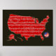 Black and red musical map of the USA. A graphic-map of the american continent with music notes on it