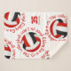 This sporty volleyball themed sherpa fleece blanket features 5 randomly arranged red, black and white volleyballs with the text, "The volleyball court is my happy place" in red encircling each volleyball in a fun typographic font, all on a white background - her name and jersey number are customizable - by katz_d_zynes