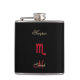 Red Black Zodiac Sign Scorpio Personalized Flask. A handy pocket flask with a red astrological symbol for astrological sign Scorpio the scorpion with gold trim, and the word Aquarius written in metallic gold script. Keep your favourite Scorpio festive and happy with their beverage of choice in this go anywhere pocket flask ready for celebration on the go!