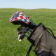 An old fashioned argyle pattern gets an update in soft red, slate blue, and tan on this unique and attractive golf head cover. At the centre is a matching blue circle banner which is lined in red. On the banner is your two letter monogram in light blue at the centre.