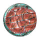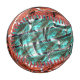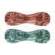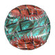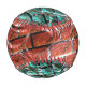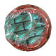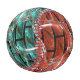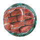 Stamped clear blue - and red -, seeming bubbles upon grating or leaning brick effect, but the image that looks like bubbles is under another image semi-transparent.