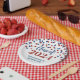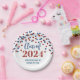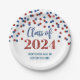 Customizable graduation party class of 2024 plates in red white and blue confetti pattern and elegant hand lettered style text.