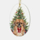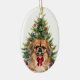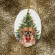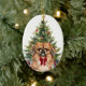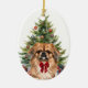 On the front of this Holiday ornament is the image of an adorable little Pekingese Dog wearing a festive red bow. The dog sits in front of a decorated Holiday tree. On the back, red and green text says MERRY CHRISTMAS", and there are additional text fields for you to customize. Make it say whatever you'd like!