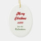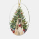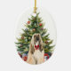 On the front of this Holiday ornament is the image of a beautiful cream and brown Afghan Hound dog wearing a festive red bow. The dog sits in front of a decorated Holiday tree. On the back, red and green text says MERRY CHRISTMAS", and there are additional text fields for you to customize. Make it say whatever you'd like!