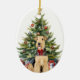 On the front of this Holiday ornament is the image of a beautiful Airedale Terrier dog wearing a festive red bow. The dog sits in front of a decorated Holiday tree. On the back, red and green text says MERRY CHRISTMAS", and there are additional text fields for you to customize. Make it say whatever you'd like!
