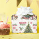 The repeated pattern on this Christmas wrapping paper includes an image of a cute Beagle dog wearing a festive red bow. The dog sits in front of a decorated Holiday tree. Stylized red and green text says MERRY CHRISTMAS", and your own signature is in two fields for you to customize. Other images included in the pattern include red decorative snowflakes, candy canes, and a peppermint lolly pop.