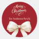 A red background, cream coloured text and bow. Merry Christmas is written with an elegant hand-lettered style script. Personalize and add your family name.