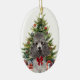 On the front of this Holiday ornament is the image of an adorable grey Miniature Toy Poodle Dog wearing a festive red bow. The dog sits in front of a decorated Holiday tree. On the back, red and green text says MERRY CHRISTMAS", and there are additional text fields for you to customize. Make it say whatever you'd like!