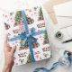 The repeated pattern on this Christmas wrapping paper includes an image of an adorable Havanese dog wearing a festive red bow. The dog sits in front of a decorated Holiday tree. Stylized red and green text says MERRY CHRISTMAS", and your own signature is in two fields for you to customize. Other images included in the pattern include red decorative snowflakes, candy canes, and a peppermint lolly pop.