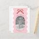 This design features modern Christmas card with a soft pink background and a deep red hand-drawn bow. The elegant scalloped edges and oval photo frame make it the perfect choice for showcasing your favourite family photo. Personalize with your family's name and photo.