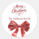 A white background, red text and bow. Merry Christmas is written with an elegant hand-lettered style script. Personalize and add your family name.