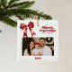 A white background, red text and a red bow. Text and photo. Merry Christmas is written with a retro style font.