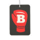 Red boxing glove with custom monogram hanging car air freshener. Personalized gift for boxer or sports coach.