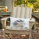 This outdoor pillow presents a Red-breasted Nuthatch who looks like he is taking charge! He is a very small bird with a rust coloured breast, blue-grey back and a black eye stripe. His head and beak are very large in proportion to his body.