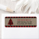 The left side of these rustic Christmas return address labels features a red and black buffalo plaid Christmas tree silhouette. The right side holds your custom text in red and black, placed on a tan banner. The top and bottom are bordered in the same red and black buffalo print that is on the tree.