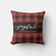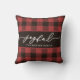 Red Holiday Buffalo Plaid with Joyful Script and Family Name Christmas Throw Pillow.