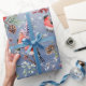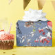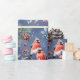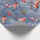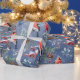 A holiday wrapping paper featuring watercolor painted Eurasian bullfinch birds feasting on red and blue berries with pine cones and branches in a repeat pattern on a blue ombre background.