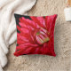 A vivid red, many petalled, cactus dahlia sprinkled with drops of water on a black background covers both sides of this square cushion. Gorgeous.