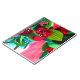 Original watercolor art of floral Red Camellia flowers with green foliage against a colourful vibrant pink and yellow background. By artist Sacha Grossel, this botanical flower design is stunning.