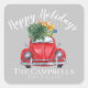Watercolor graphic features retro red coloured beetle style car loaded on top with freshly cut Christmas tree and colourful wrapped presents. Customizable holiday greeting with room for your family or business name.