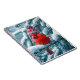 A vibrant red cardinal wearing a knitted hat sits atop a snow-covered evergreen branch, surrounded by gently falling snowflakes