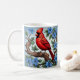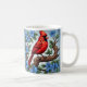 A stunning red cardinal sits proudly on a delicate tree branch surrounded by lush blue vibrant flowers. The intricate details and bold colours evoke a sense of joy and serenity.