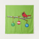 An illustration of a red cardinal on a snowy bare branch with green, red and snowflakes designed blue hanging balls. This simple design is made for bird lovers who also love and happy to celebrate their Christmas with family and friends.
