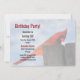 A birthday party or other event, invitation card. Designed with a photograph of a pretty red cardinal standing on a wooden stump.
