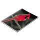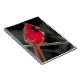 A crisp clearly detailed beautiful nature photograph. A bright red northern cardinal perched on a tree branch. You can see tufts of downy feathers gently blowing in the wind. Fluffy and cute!