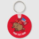 A key chain or key ring, featuring a patriotic red cardinal bird carrying the stars and stripes, astride his stoical groundhog steed, on a five-pointed star background. Change the default text to the name or message of your choice. This cartoon was inspired by some friends on an American adventure and features two of the critters that visited their Washington DC back yard.