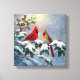 A pair of northern red cardinals perch on a holly branch covered with red berries and snow.