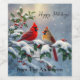 A pair of northern red cardinals perch on a holly branch covered with red berries and snow.