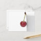 Red cherry hangs from the brim of the grey porcelain cup against white background. The summertime theme
