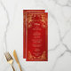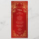 Red cherry blossoms and a gold double happiness symbol on a shimmering red background. With custom bride and groom names, the wedding date and a custom menu text.