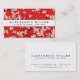 Stylish business card features a cherry blossom floral design in bright red with black and white accents. Custom name and title or role presented on a complimentary white banner with complimentary white text and accents. The back of the card is plain and simple with coordinating black text on a plain white background.